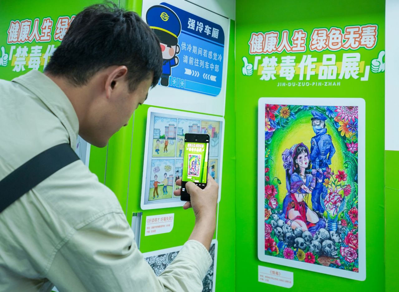 一位年轻人非常自豪地指着一幅作品跟身边的人说:“快看快看!这是我妹妹的作品,她可是禁毒宣传小能手,她在家还经常给我们科普药物滥用和毒品相关知识呢!”说完连忙拿出手机拍照打卡。现场氛围十分热烈。