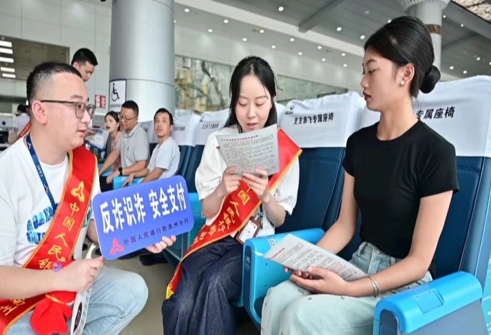 “你在预定了机票后收到这样一条短信:航班因故障、天气等原因延误或者取消,并附赠一条‘退改签’补贴链接。你会怎么做呢?”7月9日,谨防机票“退改签”骗局 不做电诈工具人——黔南州2024“全民反诈在行动”警银联手集中宣传活动走进荔波机场。公安民警、机场及银行工作人员通过设置互动答题和发放宣传资料等方式,宣传电信网络诈骗相关知识。