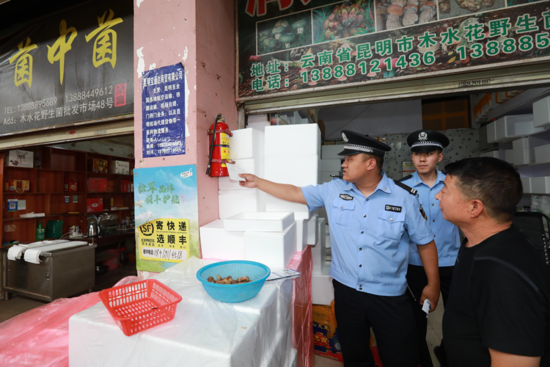 云南的夏季,天赐山珍,雨至菌出,占地30亩的云南木水花野生菌交易中心,车水马龙,商贩络绎不绝,到处弥漫着泥土与山林相融的菌子气味。当滚滚车流聚集在市场周边,当拥挤的人潮涌入木水花野生菌交易市场,官渡分局福德派出所的民警辅警始终“随菌而行”,守护百姓“舌尖上”的安全,共绘人间烟火。