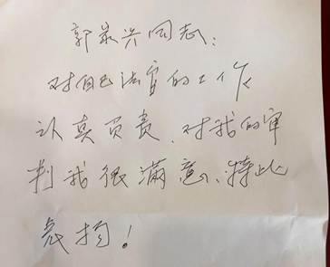 “小伙子你不错,我得表扬表扬你。”近日,原本怒气冲冲,要陪原告“告到底”的邵大爷,经北京市顺义区人民法院(以下简称“顺义法院”)立案庭(诉讼服务中心)徐四林法官团队法官助理郭家兴耐心地释法说理后,在庭前会议中表示同意调解,并当庭书写表扬信。