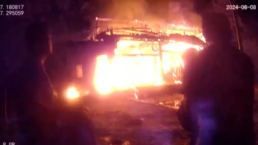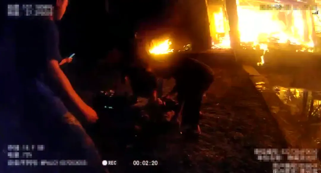 21时54分许,民辅警到达丰岩村新寨组葛某某住宅处,看到其木质结构房屋正在剧烈燃烧,墙体已基本烧毁。房主葛某某在屋外嚎啕大哭,正想往房子里冲。四人见状,迅速上前将老人拉住。