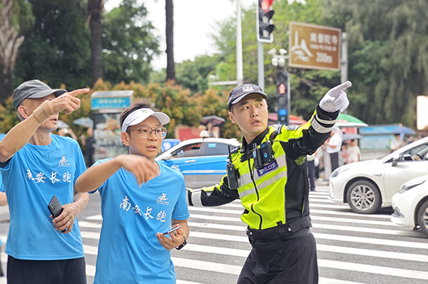 20分钟左右,见路面车流恢复了正常,郭献智戴上头盔、跨上摩托车,动作干脆利落。可还没来得及启动车辆,迎面就走来了2名群众向他问路,他手指向前方回答:“去厦门大学,你们往这个方向走比较快,过马路要注意安全。”