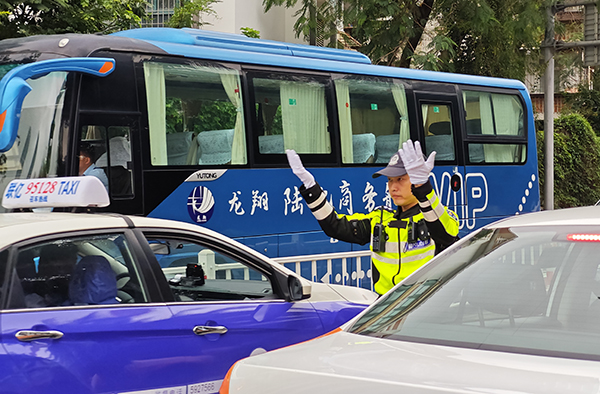 8时30分,随着游客越来越多,南普陀景区门前路段的车辆一下子多了起来。郭献智将摩托车停在一旁,快速走到车流中,挥舞着刚劲有力的手臂指挥交通,双眼不时扫视着路上车辆通行情况。“这个点位容不得半点闪失,容易造成交通拥堵。”郭献智说。