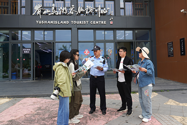 为了护航辖区旅游经济发展,嵛山海防派出所立足游客需求,主动延伸触角,把公安主责主业和做靓旅游警务深度融合,每天景区一开放,民警们就携带警用装备,穿梭在各个山头、湖泊之间,向游客宣传环保、安全事项,帮助规划旅游路线、解决实际困难。
